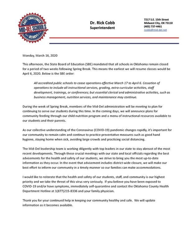 This afternoon, the Oklahoma State Board of Education mandated that all schools in Oklahoma remain closed for a period of two weeks following Spring Break. This means the earliest we will resume classes would be 4-6-20. We will continue to update our community as more information becomes available. #mdpurpose