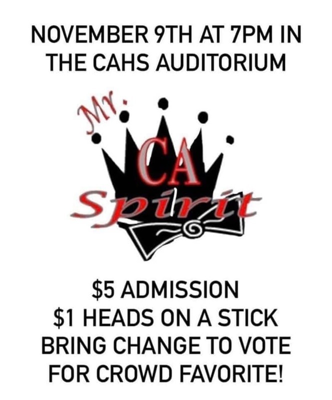 The Mr. CA Spirit Pageant, sponsored by your CAHS Pom Squad, is coming up - November 9th at 7pm in the CA PAC.