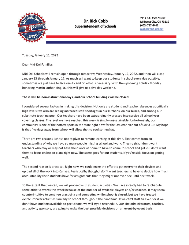Mid-Del Schools Will Be Closed January 13-17, 2022