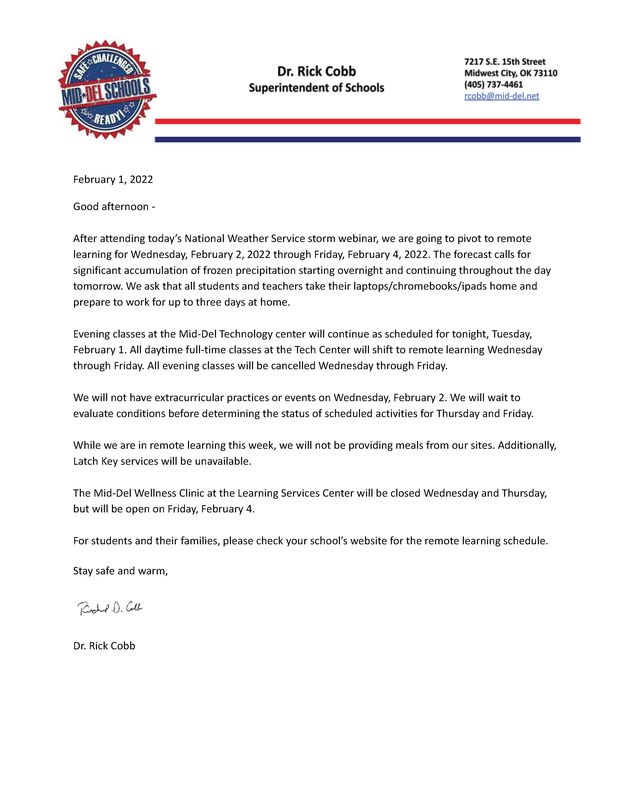 Mid-Del Schools will shift to Remote Learning February 2-4, 2022