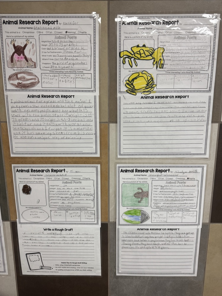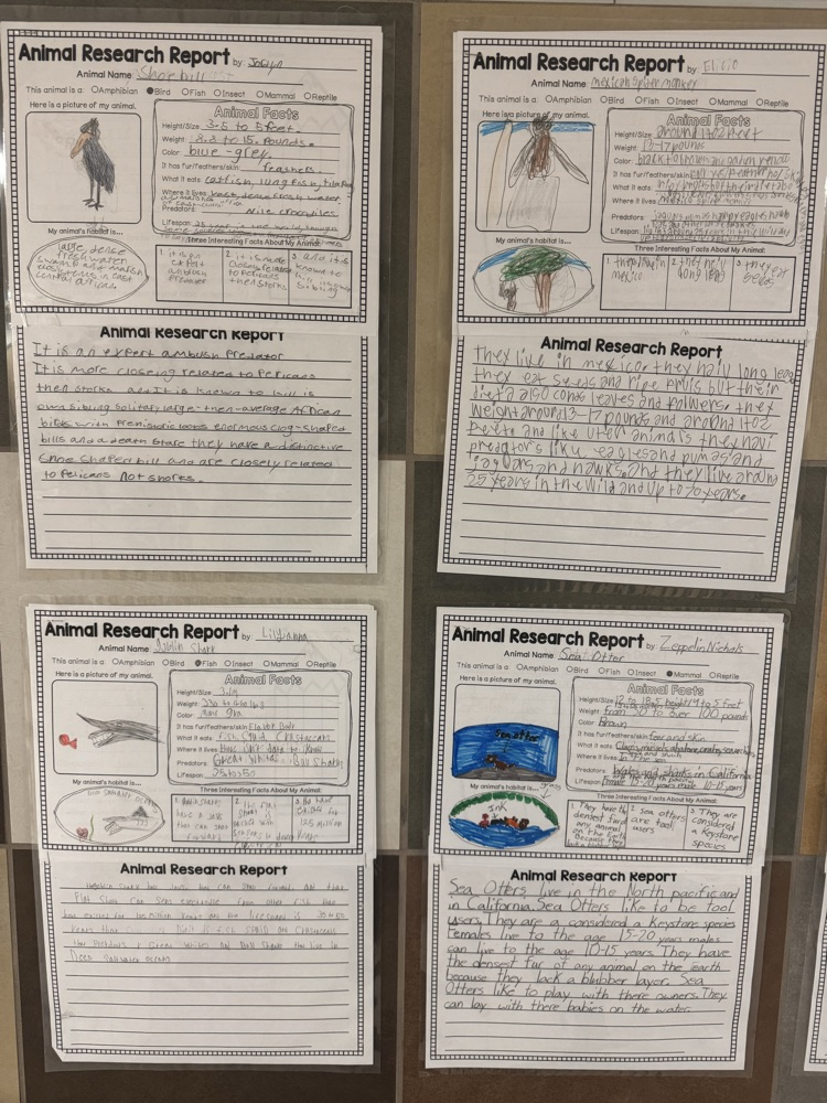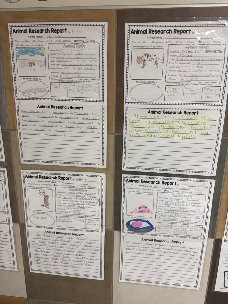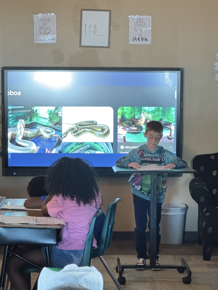 Mrs. Manning's 4th graders recently completed research projects. Requirements involved investigating all components of their animal, writing a multi-sentence report, and presenting their findings to the class. They bravely stood in front of their peers, principal, assistant principal, counselor, and teacher to share all they learned.