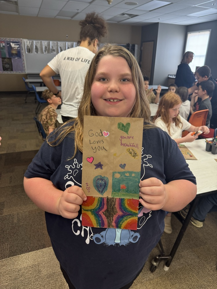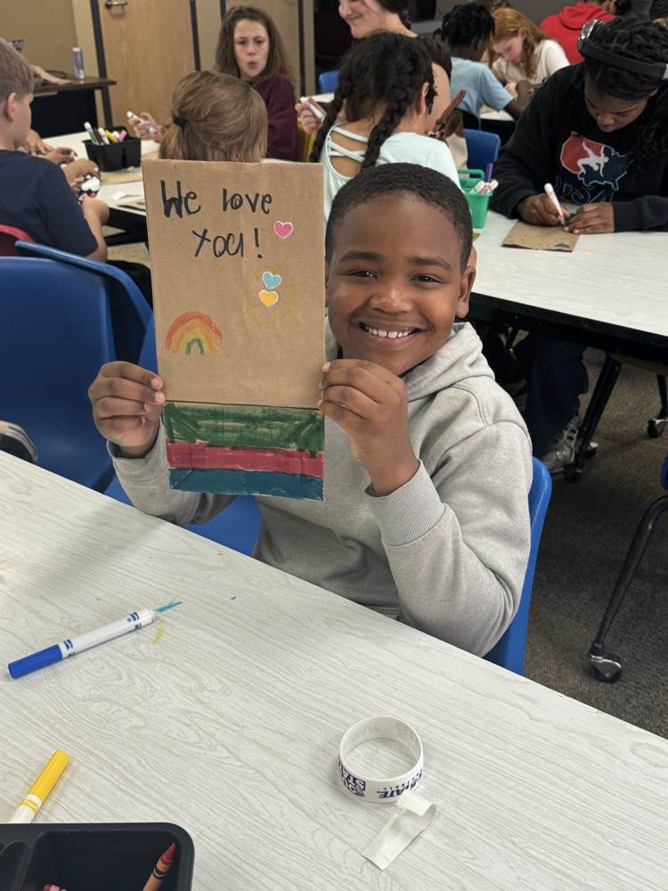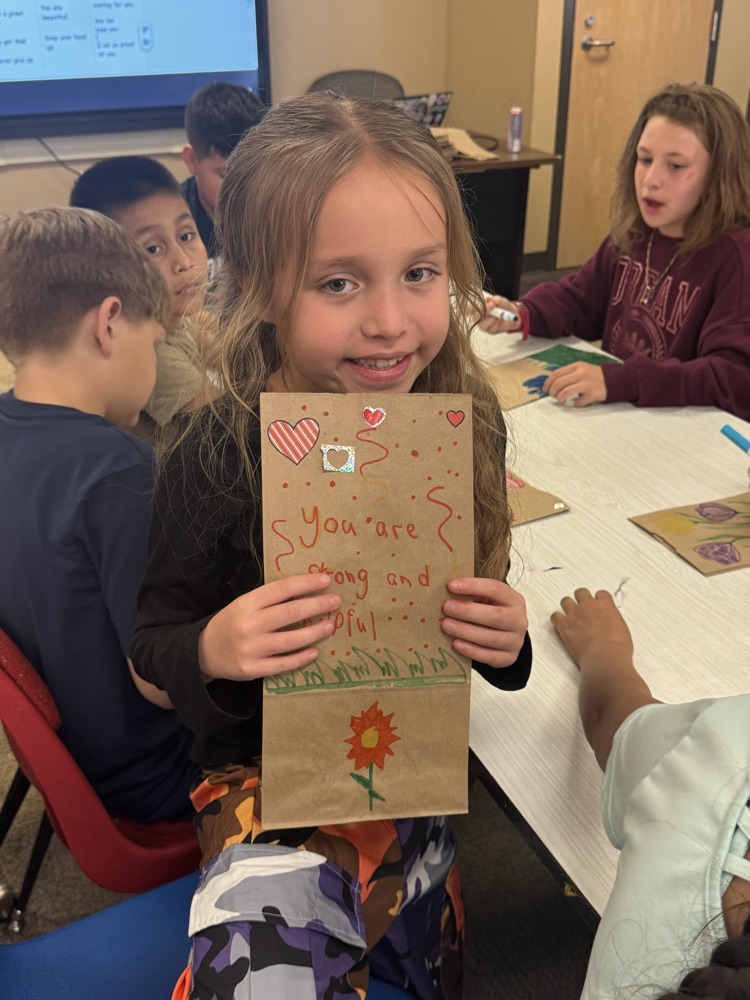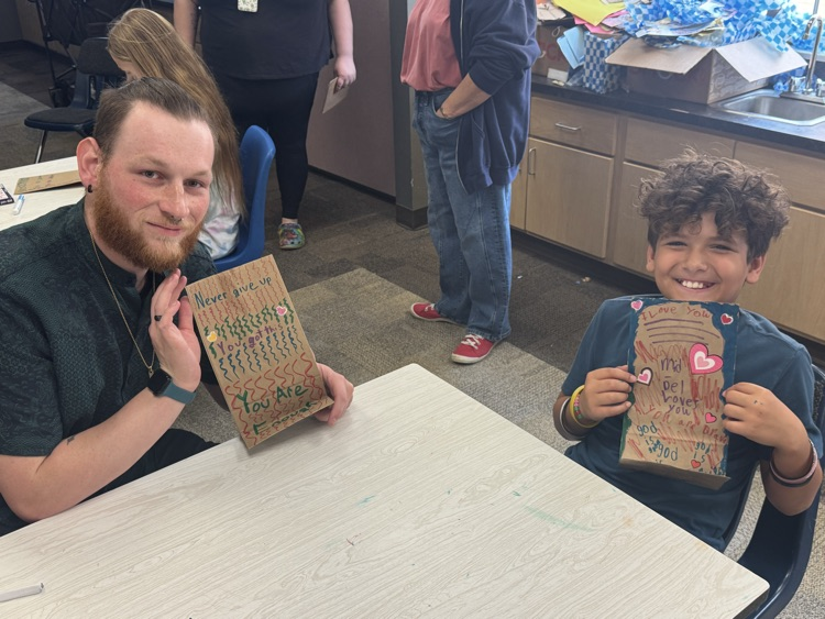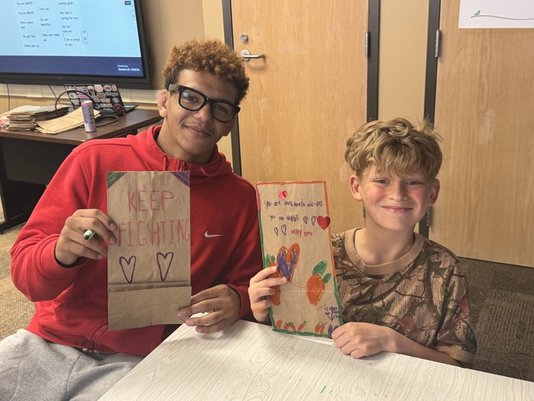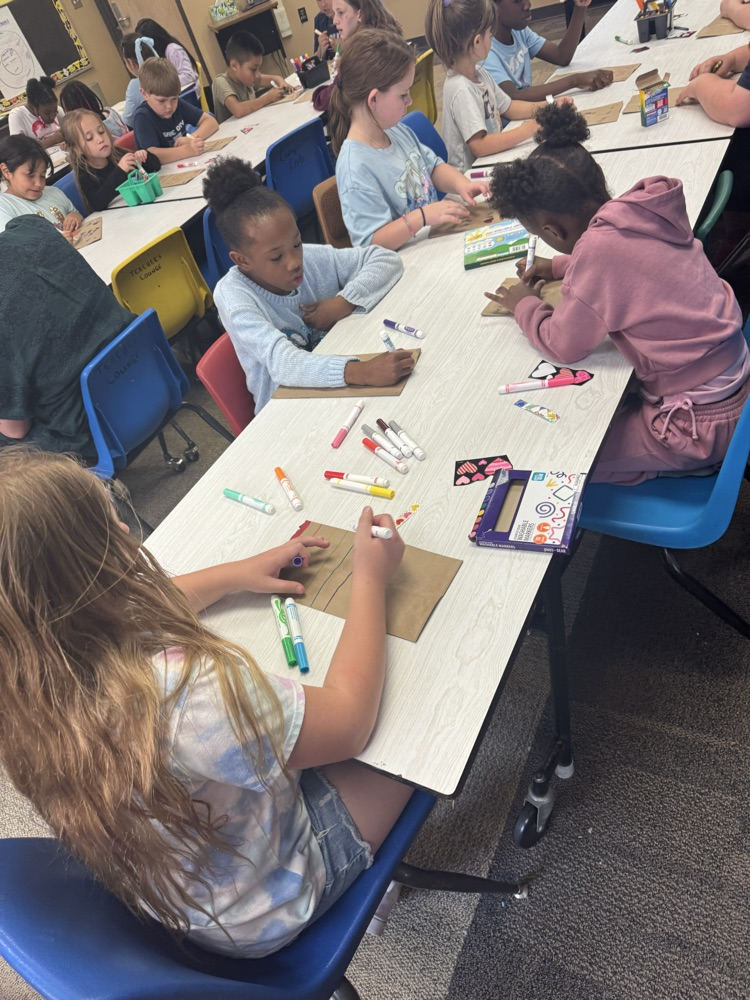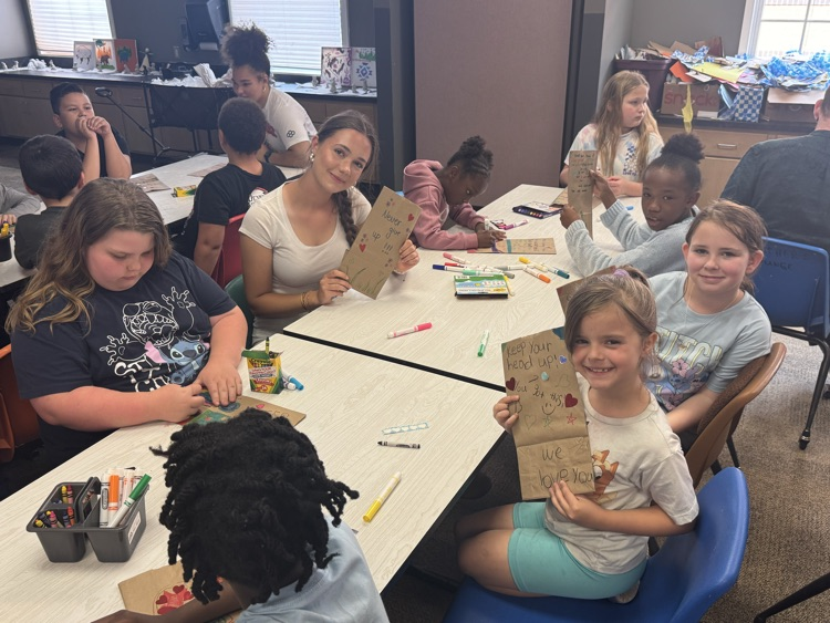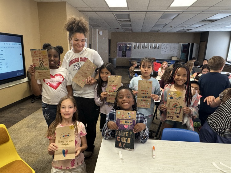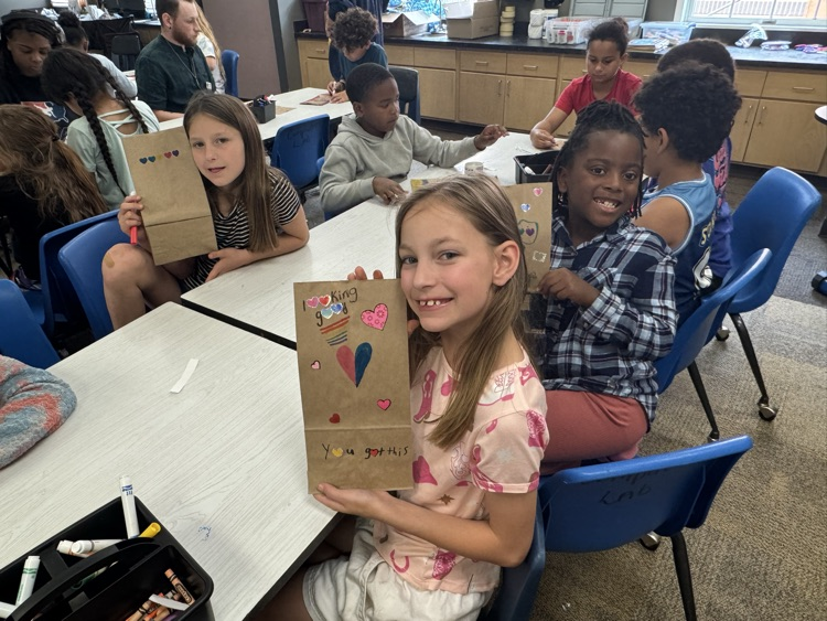 A project with a purpose. Mustang students from Mrs. Carbajal, Mrs. Parker, Mrs. Manning, and Mrs. Johnson's classes have had the opportunity to create snack bags for the OK Kids Korral. The Korral serves as a nonprofit residential facility for families with children fighting cancer. The location offers easy access to Children's Hospital, allowing families to stay close while their child undergoes treatment. Each time the family leaves, they are given a snack bag. Our Mustangs spent time writing encouraging phrases, reminders, and compliments to brighten the patient's day. Today, while they were decorating, our third graders had special visitors from Del City High School Leadership. We are so proud of our students and their hearts for others.