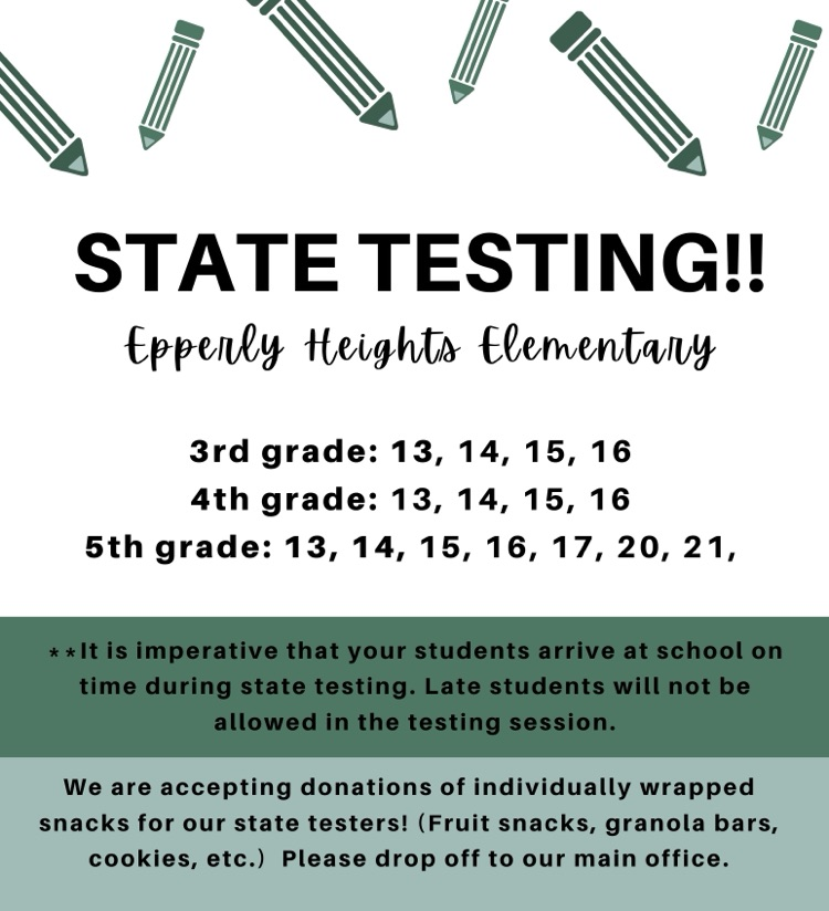 State Testing starts in 9 days! Here's a peek at your student's test dates. Parents, it is imperative that your students do not miss school on their testing dates. It's also crucial that they are ON TIME and in class by 9:00. ⏰ Late students will not be allowed into their classroom during a testing session.