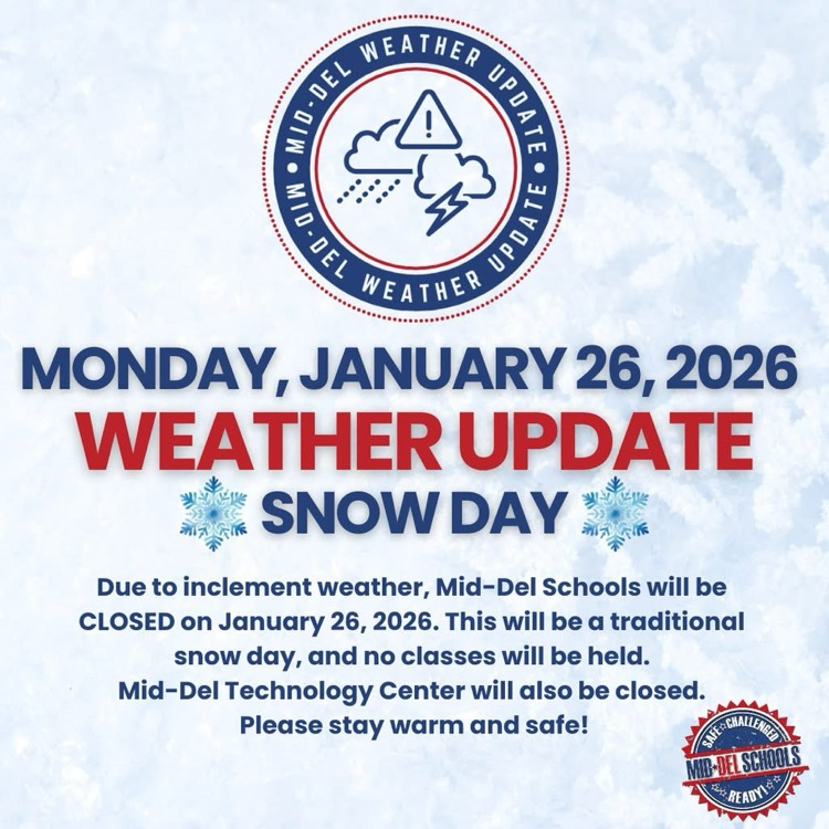 Due to inclement weather and hazardous road conditions, Mid-Del Schools will be closed on Tuesday, January 27, 2026. This will be a traditional snow day, and no classes will be held. Mid-Del Technology Center will also be closed.